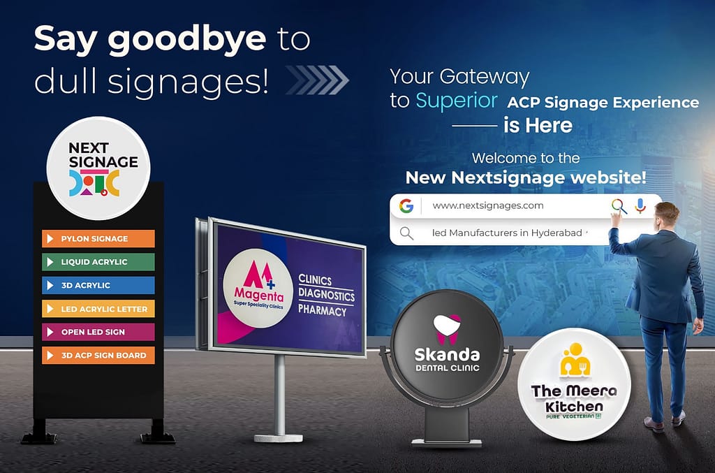 Next Signages is a leading provider of custom LED signage and visual communication solutions, dedicated to elevating brand presence and customer engagement for businesses across Hyderabad and beyond. Our expertise encompasses advanced LED displays, 3D signage, acrylic fabrication, and enduring architectural cladding systems. With a commitment to quality, innovation, and precision craftsmanship, Next Signages delivers impactful signage that inspires attention and drives business growth. Founded on the vision that powerful signage unlocks true business potential, we continue to shape how brands are seen and remembered.